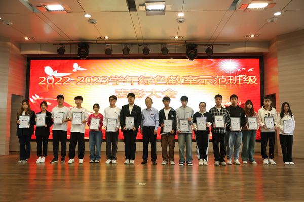 陈义文部长宣读了《关于表彰2022-2023学年绿色教室示范班级的决定》,授予2022级人力资源管理本科2班、2022级金融学本科1班、2022级人工智能本科1班、2022级人工智能本科2班、2022级市场营销本科1班等15个班级“绿色教室示范班级”荣誉称号。左宗文副校长为获奖团体颁发证书并合影。