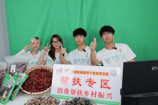 图为陈乐(右二)和同学们参加助农直播,助力乡村振兴