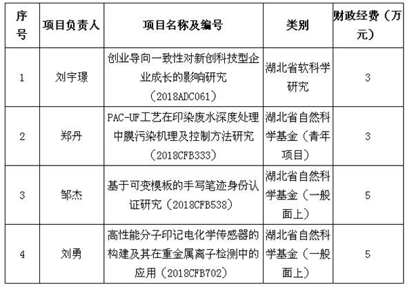 新闻中心讯(特约记者 曾荷爱)近日,湖北省科技厅下发了《关于下达2018年湖北省科技计划项目(第一批)的通知》(鄂科技发计﹝2018﹞3号),英国正版365官网获批2018年度湖北省科技计划项目4项,其中2项为湖北省自然科学基金一般面上项目,1项为湖北省自然科学基金青年项目,1项为湖北省技术创新专项(软科学研究)项目,总资助经费16万。总立项数和总立项经费均创历史新高,立项数位居全省同类高校前列。具体立项情况见下表: