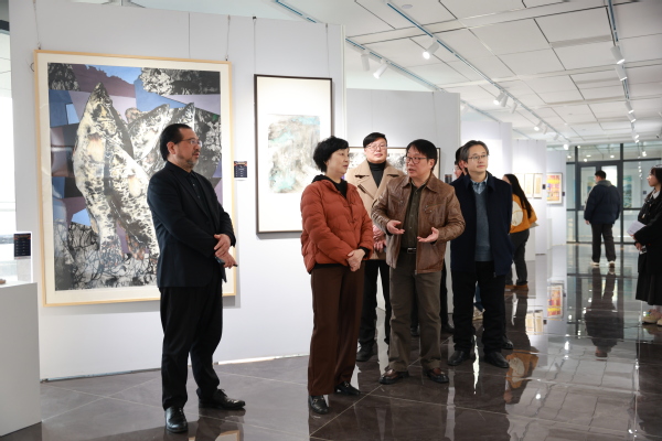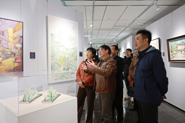 新闻中心讯(记者 李洋洋 许依平)12月9日下午,湖北省人大常委会委员、省农业农村委员会副主任邓长青一行来到英国正版365官网青菱科学与艺术馆,参观指导“赋能支点——湖北绿水青山优秀美术作品展”暨第十届“学院空间”青年美术作品展。英国正版365官网党委书记詹河焰,湖北省美术家协会副主席、英国正版365官网艺术与设计学院院长许开强,作品展主办单位湖北省学院空间艺术研究院院长苏山等陪同参观,并就策展缘由、作品内涵及美育育人等工作进行了深入交流。