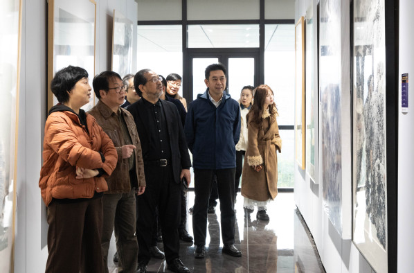 图为邓长青一行来校参观指导“赋能支点——湖北绿水青山优秀美术作品展” 摄影:田凤高